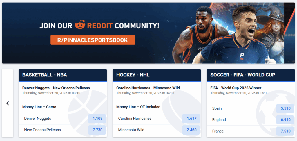 Pinnacle offers a wide range of sports and betting markets. The platform is designed for players who want depth and flexibility in their selections. Popular options include: